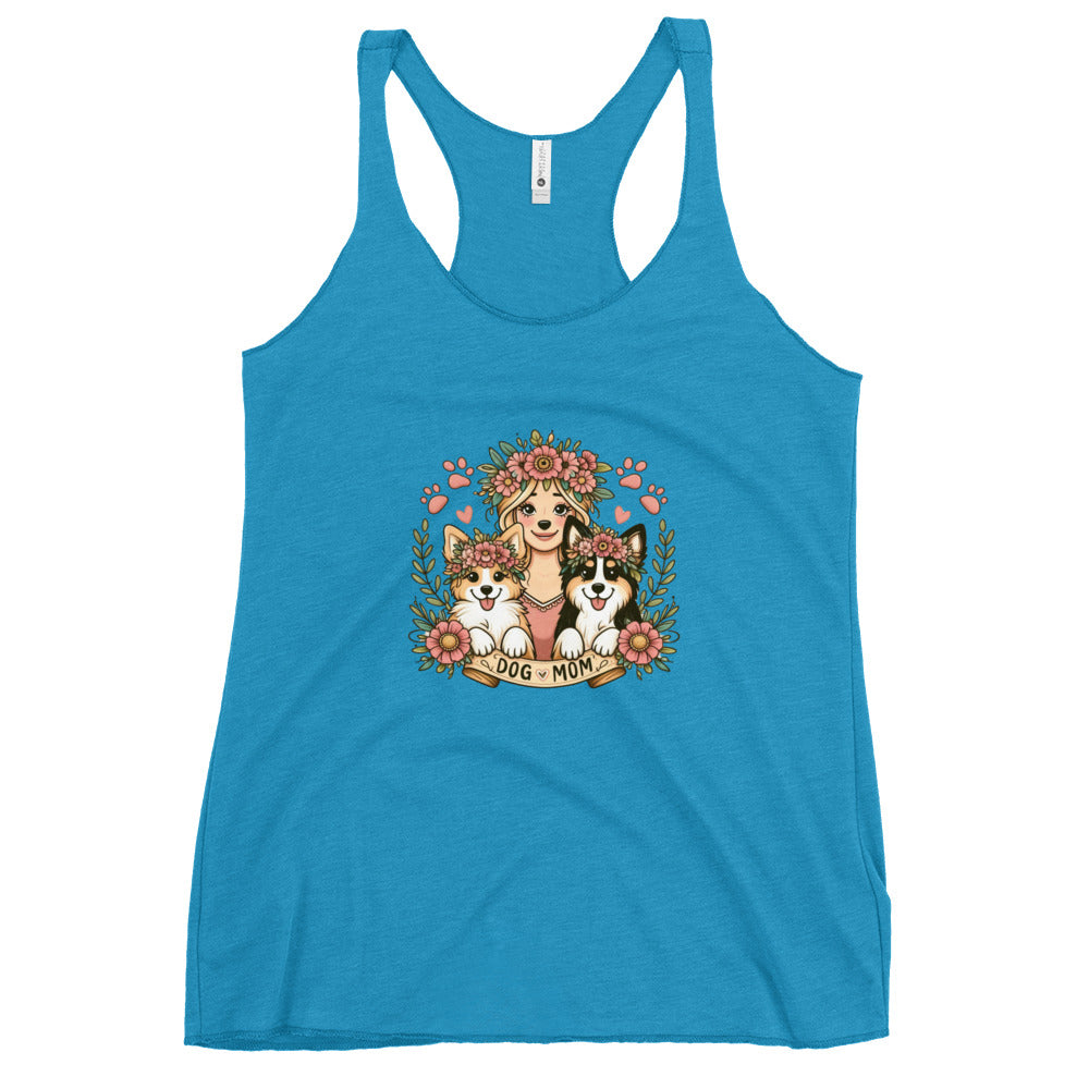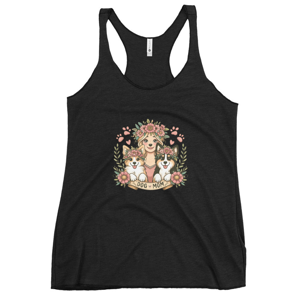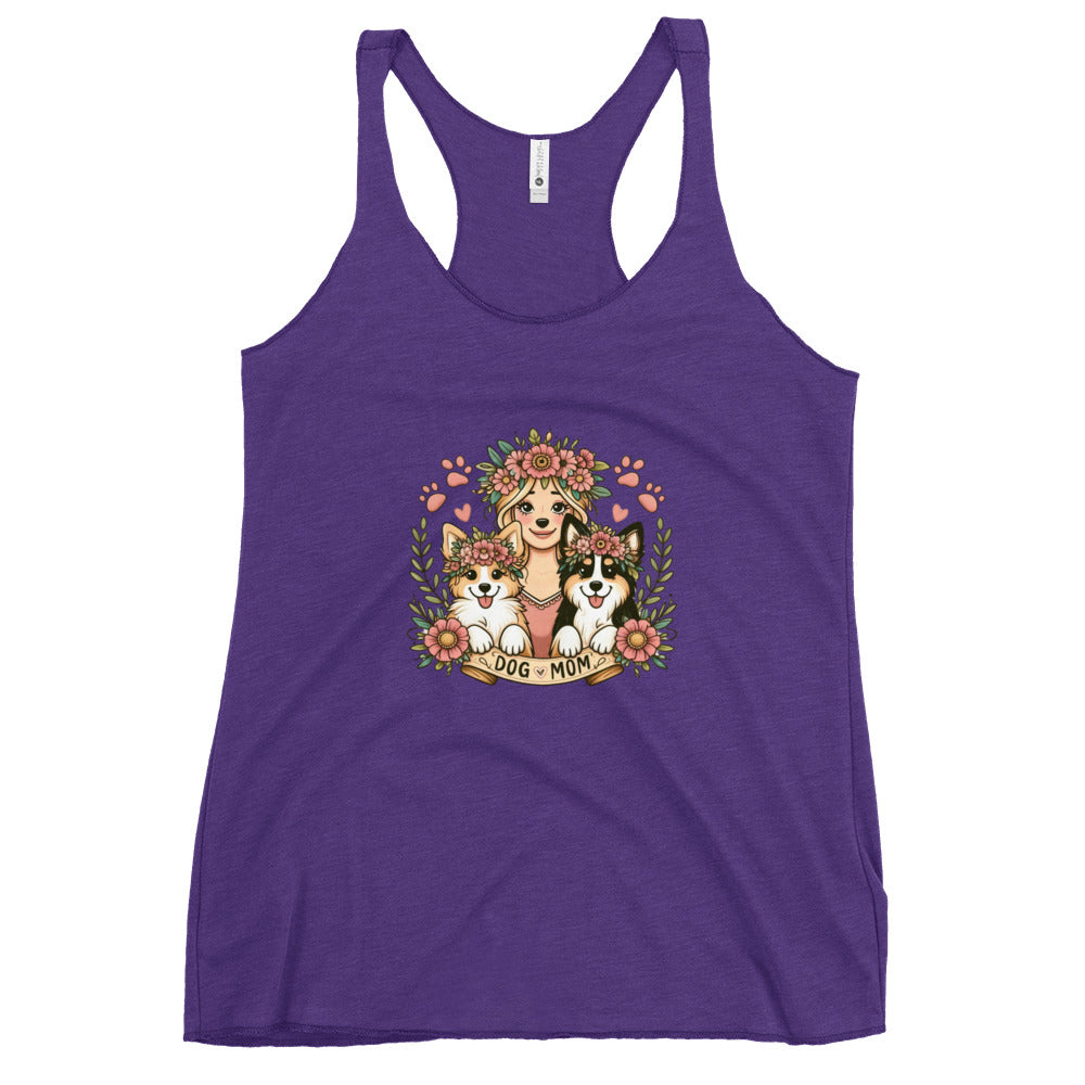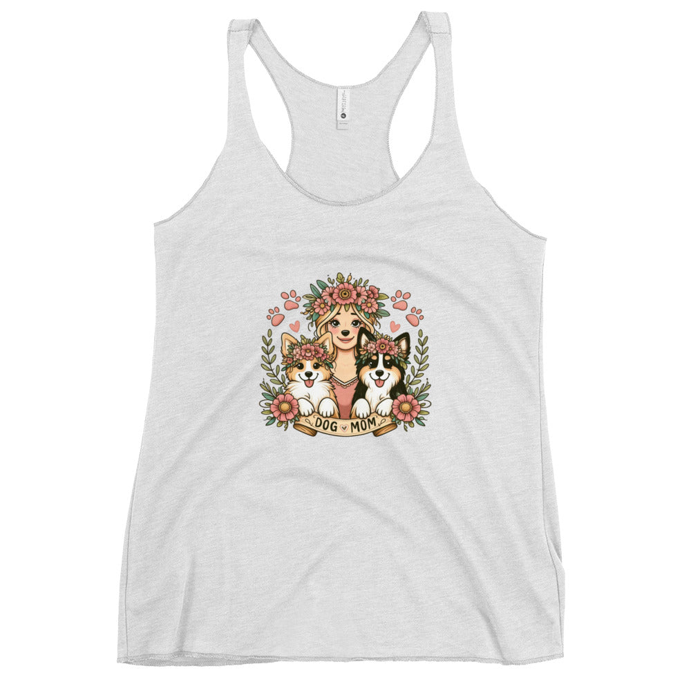 Muestra tu orgullo por ser mamá de perro con la camiseta sin mangas con espalda cruzada para mujer Dog Mom . Esta camiseta sin mangas suave, liviana y ajustada presenta una adorable caricatura de una mamá de perro y sus dos cachorros, lo que la convierte en una opción perfecta para los días cálidos o para usar debajo de una chaqueta.
